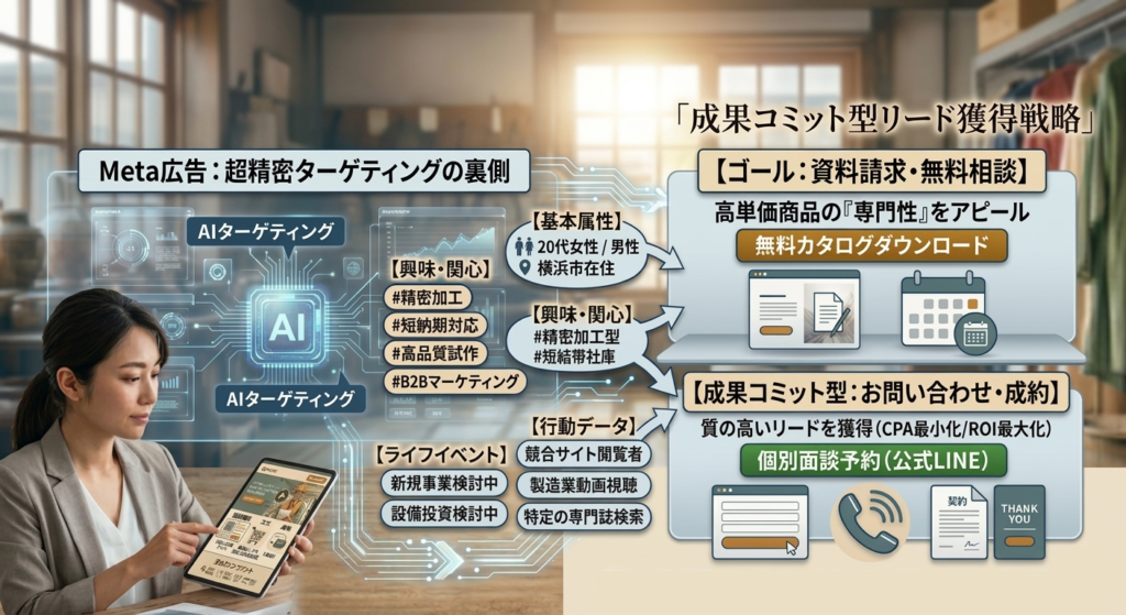 Meta広告には、Facebook/Instagramアプリ内でフォームが完結する「リード獲得広告」があります。ユーザーは外部サイトに飛ばずに、タップ数回で資料請求や個別相談の予約ができるため、離脱率を劇的に下げることが可能です。