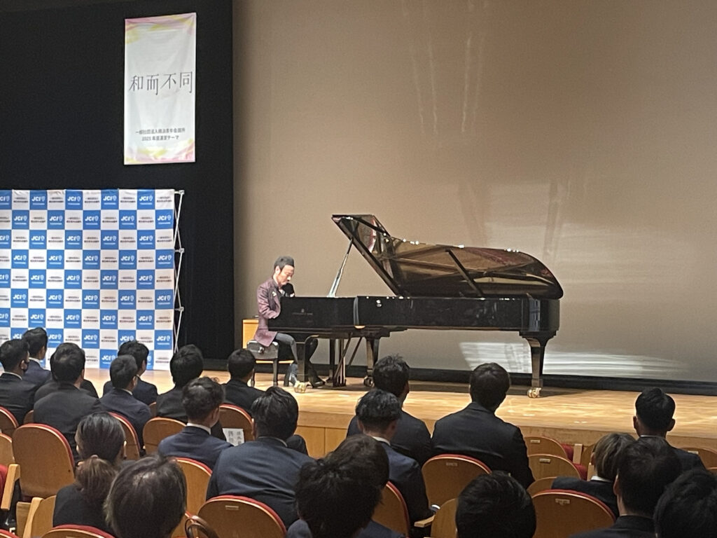 今回の例会では、ピアニストの西川悟平氏を講師にお迎えし、「挑戦」をテーマにご講演をいただきました。西川氏は、7本の指しか動かないという困難を抱えながらも、世界を舞台に活躍されている方です。その歩みに込められた強い信念と前向きな姿勢に、深く心を打たれました。「できない理由ではなく、できる方法を探す」という言葉が特に印象的で、自身の活動においても大切にしていきたいと感じました。